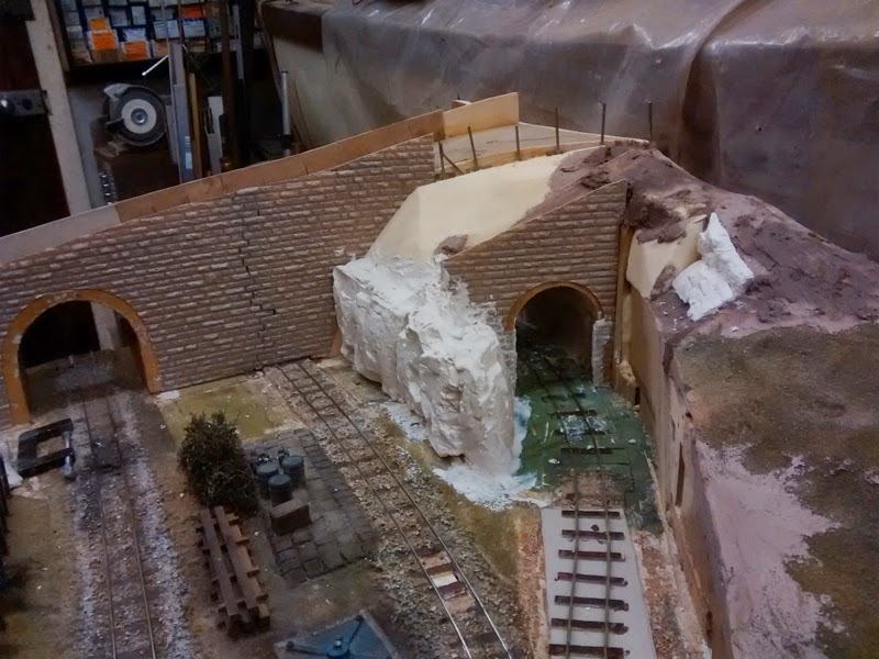 In the photos above and below can be seen the results three other tasks. The roadway side wall has been cut away on the inside. This lessens the bulk of the bridge stonework and adds a bit of interest. The outside wall will change from bridge stone to dry stone wall. We pressed Laurence into action, making the rail fence posts. The tunnel mouth parapet has been increased in height. We're not sure of the final arrangement of the rocks/ground over the tunnel, but this seemed like a good idea.