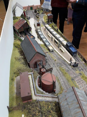 6th April (Laurence away with the family) - Geoff had been working on scenery during the week and had fulfilled a long held desire to add grass to the front of the platform. He'd also filled in bare and unsightly areas. Some sea-foam trees had taken a bashing and the brittle structures were almost consigned to the bin (we won't use it again). Stephen rescued them, glued limbs back into place, sprayed them matt dark brown and, using a new can of hairspray, gave them a dusting of fresh green foliage. They looked nice, so he then carried out the procedure to the large tree at the top of the bridge track, giving it a much needed facelift. A step was crafted, painted and fixed in place between the furnace and the generator rooms - an omission that had irked Geoff for a long time. 'Water' was added to the ground beneath the water tower. Geoff has been using a thin superglue for this purpose that hardens with a small ultraviolet torch (part of the package). The whole layout was then given a 'deep' clean using small brushes and careful vacuuming. It is amazing how you get used to a certain level of dust and debris.